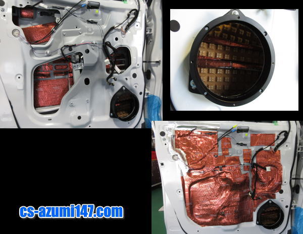 フルオーディオシステムの準備で車室内のフルデッドニング施工を行って、音質改善には欠かせないフロントドアのデッドニング施工も行っています。
